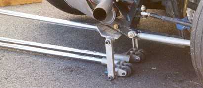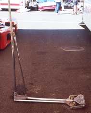 These show some examples of low clearance fastjacks used under low cars. Note the commercial jack can reach under a Europa far enough to come up directly under the forward box section. The home made unit is safer as it moves further overcenter, but the handle is a weak point and needs another brace to strengthen it. I have no idea whose these are, I simply took these photos at PIR for some list folks who had never seen this style jack before.
